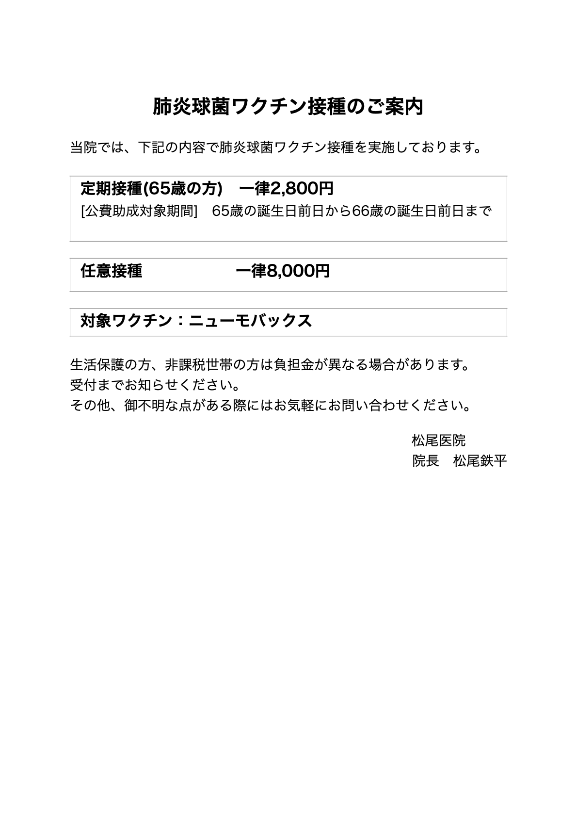 当院でのワクチン接種について 詳細は下記の通りです。なお、接種予約の受付は「お電話のみ」の対応とさせていただいております。(Webサイトからの予約受付無効) インフルエンザ予防接種 2025年度の予防接種について 令和7年10月8日(木)より、接種受付を開始しました 《接種料金》 ¥4,000-(税込) 予防接種に関してお尋ねになりたい事などありましたら、お電話にてお問い合わせください なお、 ワクチンの在庫数に限りがありますので、在庫が無くなり次第、予防接種終了とさせていただきますこと、予めご了承ください 新型コロナワクチン接種 2025年度の予防接種は、令和7年10月開始(予定) 肺炎球菌ワクチン接種 表はクリック or タッチすると高解像度で表示されます